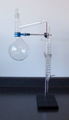1000ml DISTILLING APPARATUS WITH GRAHAM CONDENSER The glass ware is made of high quality borosilicate glass and can withstand up to 600'C. This apparatus set is suitable for pure water distillation and other kinds of distillation in the laboratory. The flask capacity is 1000ml and the condenser is 200mm. The stand has a heavy rectangular metal base, 5' x 8". It is drilled and threaded to accomodate a plated steel rod (included). The base is finished with chemical resistant enamel paint. The stand is 20" tall. The burette clamp has round jaws that will gently hold and lock at any angle. The single jaw opens approximately ?" to 1¾" and is rotatable 360°. The overall length is approx. 6½". The four prong clamp extension attaches to the stand rod with a right angle clamp holder.You will not be disappointed with